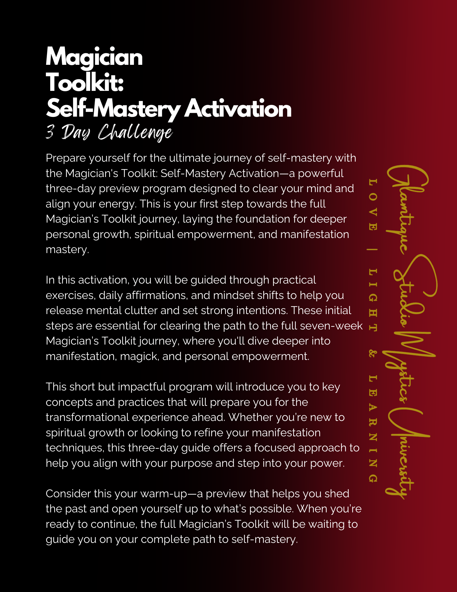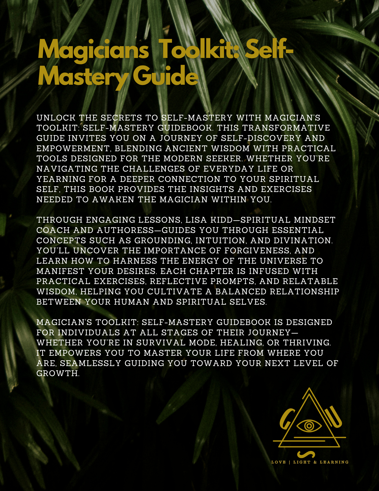 The core Magician’s Toolkit experience. This is only for the self mastery portion of the program. Though you will receive all of the books, with this purchase option; when we work together, we will only be going over the self mastery part. If you would like to do the whole complete program, I suggest you get the Magician’s Way VIP version.